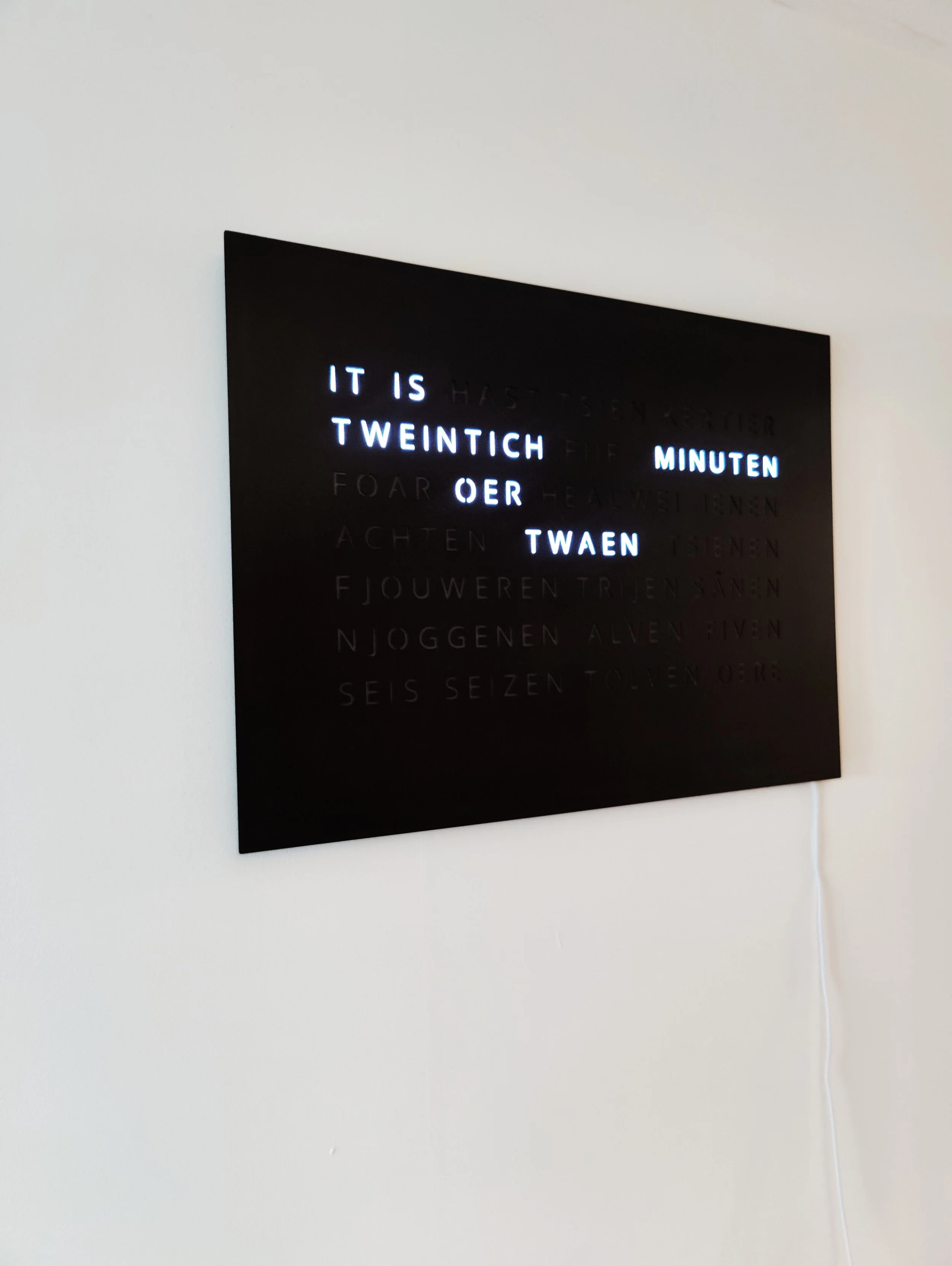 Het ontwerp is minimalistisch en krachtig tegelijk: de uitgesneden letters lichten subtiel op en tonen de tijd in woorden, waardoor de klok rust en balans uitstraalt.